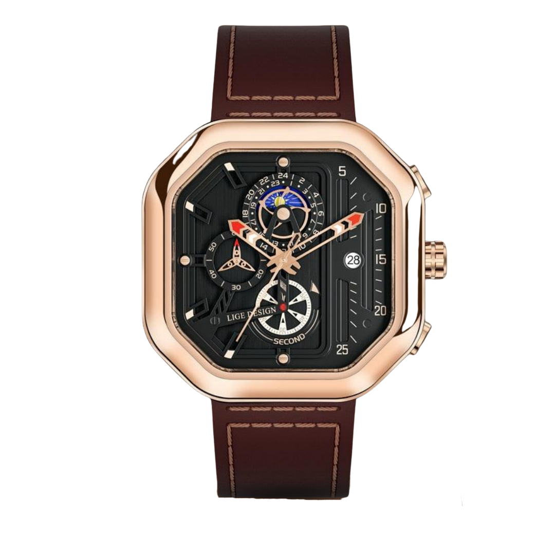 With its luxurious leather strap and sleek square design, this watch stands out in any crowd. The precise quartz movement ensures that you are always punctual, while the chronograph function is ideal for those who need accurate timekeeping. The watch is water-resistant for added durability and is built to keep up with your active lifestyle, whether you are at the office or exploring the great outdoors.